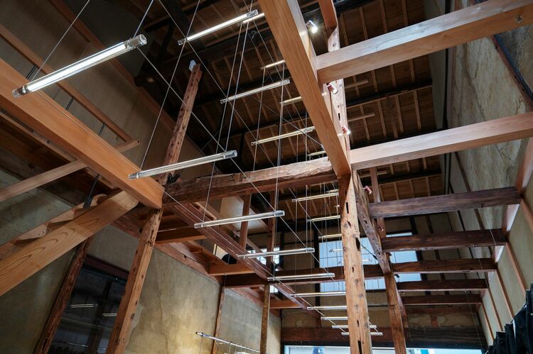 古い建材を生かして補修部分を重ねる。空中に並ぶ照明は、背の高い織機、高機(たかばた)をイメージしている