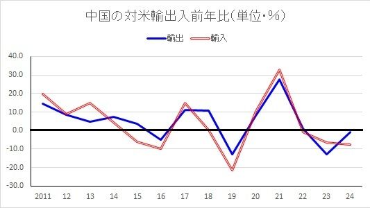 中国の対米輸出入の前年比の推移を見ると(下図参照)、2021年のバイデン政権成立後、22年以降は輸出入とも減少または横ばいで推移しており、伸びていない。