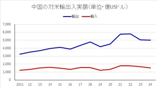 確かに2022年以降は輸出入とも伸びが止まっている。中国の対米輸出については2023年には減少もみられた。ただし、2020年以前に比べるとあまり減少していない。