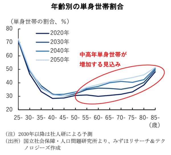 多くの結婚適齢期世代が結婚をしないという選択肢を取ると、今後数十年にかけて50〜70代の単身世帯の割合が激増することが予想されます。