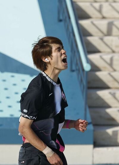 パリ五輪スケートボード男子ストリート決勝で5回目のベストトリックで技を決め、雄たけびを上げる堀米雄斗選手の耳には白いイヤホンが(写真:共同通信社)