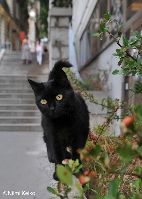 この猫は、階段脇にある植え込みの枠を器用に歩いていました。ときどき通りを歩く人からなでられるたびに、満足そうな表情をしていました。