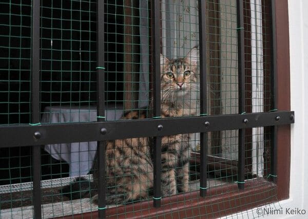 外に出て迷子にならないようにネットが張られていました。猫が外を眺めるのにちょうどよいスペースの出窓です。