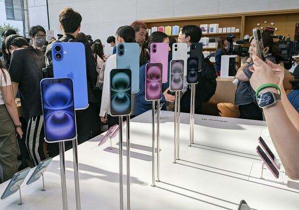 陳列された「iPhone16」シリーズ=9月20日午前、東京都渋谷区の「アップル表参道」(写真:共同通信社)