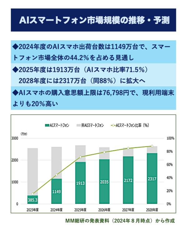 スマートフォン市場では今後、製品の主流はAI機能を搭載した「AIスマホ」になると言われています。調査会社の予測はさまざまで、例えば、カウンターポイントは「生成AIスマホの世界市場シェアは2024年の8%程度だが、2027年までには40%に拡大し、出荷台数は5億台を突破するだろう」と指摘。一方、MM総研は①2024年度のAIスマホ出荷台数は1149万台で、スマートフォン市場全体の44.2%を占める、②2025年度は1913万台(AIスマホ比率71.5%)、2028年度には2317万台(同88%)へ拡大するなどとする予測を公表しています。