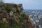 街中から見上げた米子城本丸の石垣。画面中央、ひときわ高く天守台が聳えている