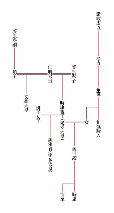 永直は官吏となってから、ここに晩節に及び、勘解由次官を歴任し、判决の道についてよくその趣旨を究めた。その勘解由使となった者は、今でもなお、基準とした。かつて大判事興おき原敏久(はらのとしひさ)や明法博士額田今人(ぬかたのいまひと)たちは、刑法の難義数十事を抄出し、大唐に遣わして問おうとした。永直はこれを聞き、自ら請いてその義を詳しく解いたところ、歴年の疑滞は、一時に氷解した。唐に遣わす問いは、これによって中止となった。長子の(讃岐)時人(ときひと)は父永直の業を伝え、姓を和気朝臣と改めた。少女は光孝(こうこう)天皇の更衣となり、源(みなもと)皇子旧鑑(もとみ)を産んだ。