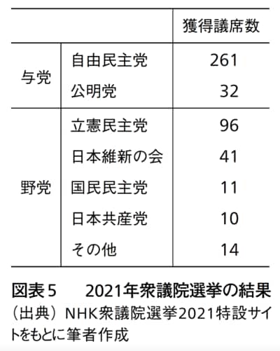 実際の選挙結果を図表5に示します。2021年衆議院選挙においては、自民党が多くの議席を獲得しました。