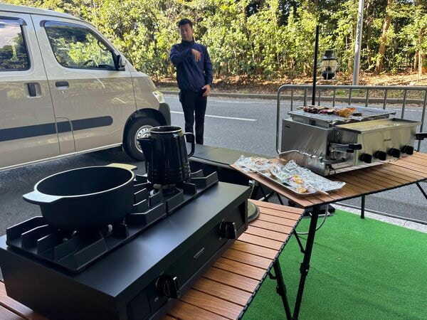 水素カートリッジを用いた、キッチンシステム。トヨタモビリティ神奈川の「キャンパー アルトピアーノ」などを展示してキャンプの雰囲気を演出(写真:筆者撮影)