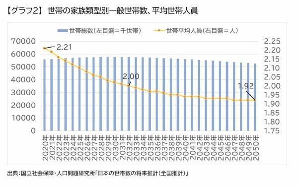 国立社会保障・人口問題研究所の推計によると、2020年に2.21人だった平均世帯人員は、2032年には2.00人に減り、2033年には平均2人以下となり、2050年には1.92人まで減少する見込みだ。