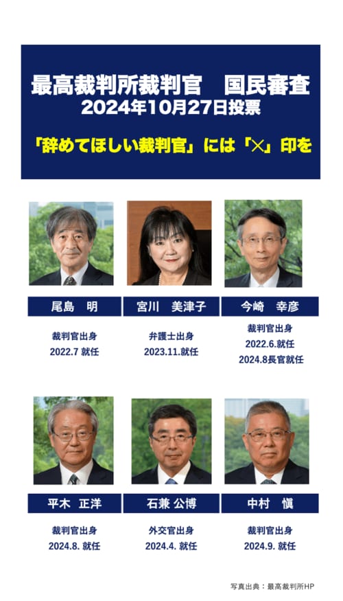 今回の国民審査で対象となる最高裁の裁判官は、次の6人です。いずれも2021年10月の前回衆院選以降に最高裁の裁判官に就任した人たち。このうち、宮川氏は弁護士出身、石兼公博氏は外務省出身の元行政官、そのほかの4人は裁判官出身です。