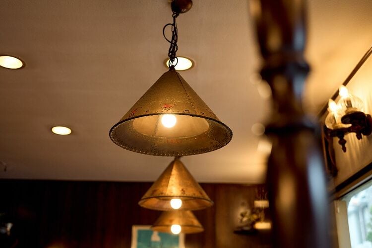 店内に入ると目を引く、銅製のランプシェード