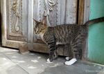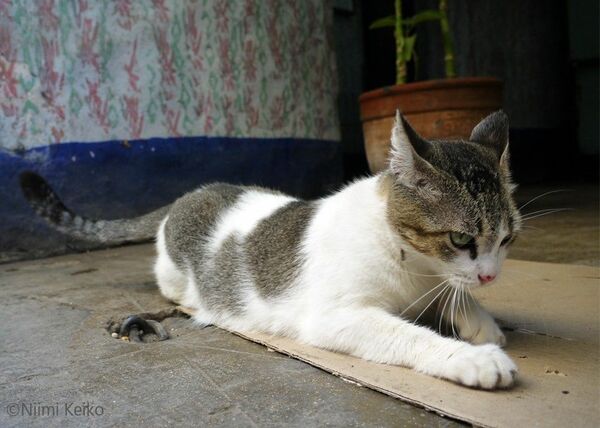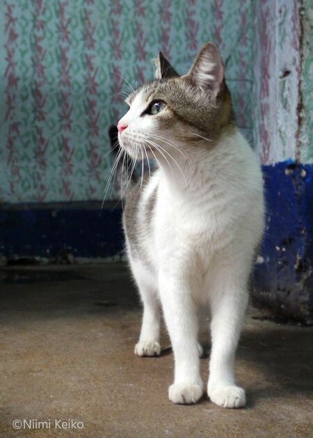 食料品の配給所にいた猫です。近所の家から出勤しているようです。配給所を訪れた人から、「やっ。おつかれさま」と、声をかけられていました。
