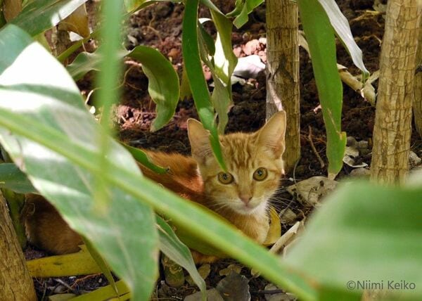 公園の植え込みの中をよく見ると、猫の姿がありました。