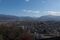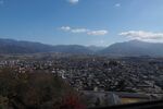 天守から眺めた城下と大野盆地。山並みの向こうは美濃だ