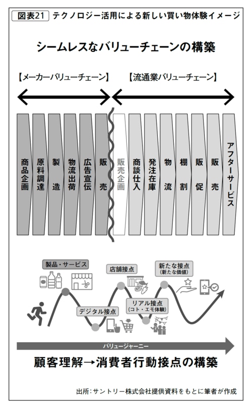 これは顧客の買い物体験の向上を実現し、ファンを増やしていくのが狙いだ。こうした活動によって、在庫の適正化やオペレーションの省力化により、コストダウンも可能になる。これらを実現するためには、メーカーと流通業界との間をシームレスにつなげたデータ分析が必須であり、顧客の購買行動などの可視化などのために、AIやデジタルツールが活用されている(図表21)。
