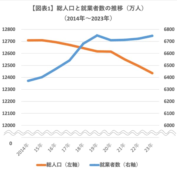 他方、就業者数は、新型コロナの影響で2019年から2020年にかけて減少した例外はあるものの、おおむね上昇トレンドにある。2014年の約6300万人から、2023年までに6700万人を超える水準に増加した。人口がおよそ300万人減った間に、就業者数はおよそ400万人増えたのだ。