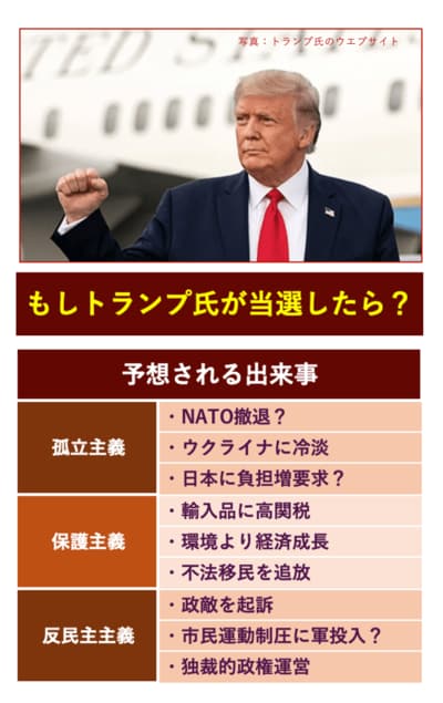 日本に対しても「守ってほしいなら対価を支払うべきだ」との姿勢を強めることが想定されます。トランプ氏はこれまで、米国は日本を守るが日本は米国を守る義務がない日米安保条約の片務性に不満を示したり、米軍駐留経費の一層の負担増を要求したりしました。「返済される見込みや何らかの見返りがない出費をするつもりはない」と語ったこともあります。大統領に就任すれば、日本に一層の負担を求めることが予想されます。