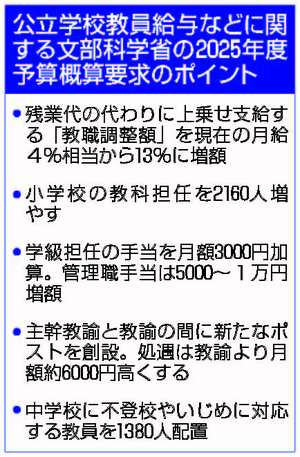 文部科学省は2025年度予算の概算要求で「教職調整額」の大幅増など、教員の待遇改善を目指すが…(表:共同通信社)