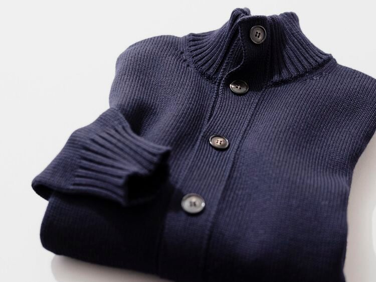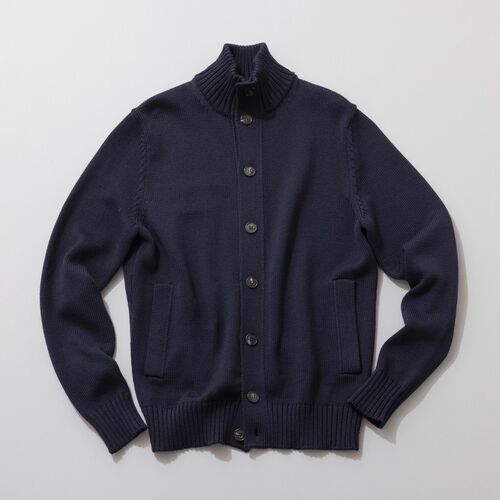 特にこの中細編みのカーディガン「CHIOTO」は、糸量が多く密度の高い平編みを採用しており保温性と耐久性、それにクリーンな質感を兼備。ボタンには高価な角製のホーンボタンを用いるなど、リッチな仕立てを貫いたブランドの人気モデルだ。