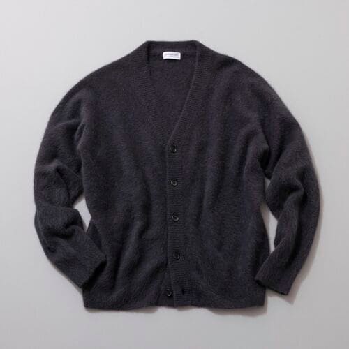 この一着は希少なブルーフォックスとウールを混紡した、ブランドの定番素材を用いたカーディガン。独特なシャギー感が着こなしに味わいをもたらすところが大きな魅力。なめらかな細編みであるが肉厚地であり、しっかりとした保温性も兼ね備える。落ち着いたグレーカラーもいろいろな服装に合わせやすい。