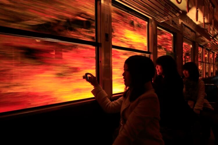 ただし車内は真っ暗なので、座席などにスマホやカメラを押し当ててなるべく固定した状態でシャッターを押そう。それでも写真がぶれてしまう可能性が非常に高いが、列車に揺られながら紅葉を眺めているという臨場感は間違いなく表現できる。