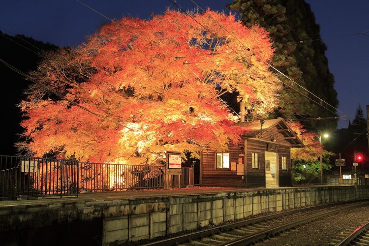 さて、トンネルを抜けて二ノ瀬に到着したら、こちらの駅で下車しよう。ホームには真紅に色づいた立派なモミジがライトアップされており、旅人を快く出迎えてくれている。