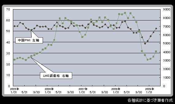 銅は工業製品の製造に不可欠な非鉄金属であり、その価格は製造業の「体温」と言われる。銅相場と中国の製造業購買担当者景気指数(PMI)を重ね合わせると、上記のグラフになる。これを見れば、中国の景気センチメント改善に伴い、銅の国際価格が上昇している様子が分かる。
