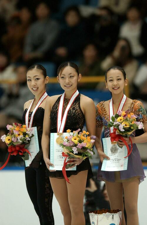 2004年12月26日、全日本選手権、右から2位の浅田真央、1位の安藤美姫、3位の村主章枝 写真=日刊スポーツ/アフロ