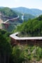 案内された先には、鉄骨の上に作った工事用道路が、山に巻きつき、谷を渡り、ダムの天端(一番上)の高さまで続く、見たことのない風景が広がっていた。その向こうに、ダム完成後に使われる予定の付け替え道路の橋脚が聳え立ち、巨大なクレーンが首を伸ばしている。
