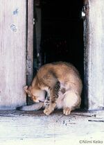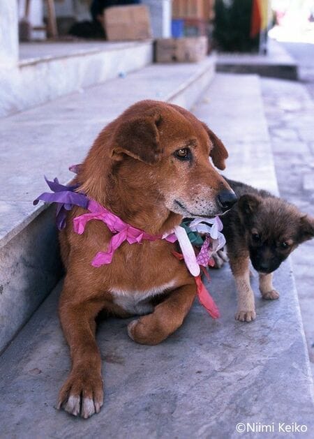 パロのメインストリートに首飾りをつけた老犬がいました。瀕死状態の子犬をくわえて連れてきて自ら介抱し、小さな命を守ることができたのだそうです。
