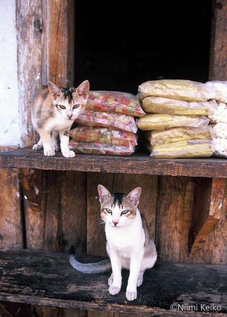 すると、ひと回り体の大きな猫が現れました。1年前に生まれた兄だそうです。お兄さんもきれいで男前の猫なのでほめてやりました。母猫は店番が好きではないので、外に遊びに出かけているとのことでした。