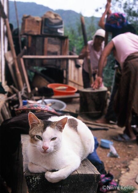 餅をついているのかと思ったら、唐辛子や香辛料を潰して、調味料をこしらえているのでした。ブータン料理は、とにかく唐辛子がいっぱい入っていて激辛なのです。それに背を向けていた猫は、「向こうを見ると、目がしょぼしょぼするんだ」と、目を細めに開けていました。
