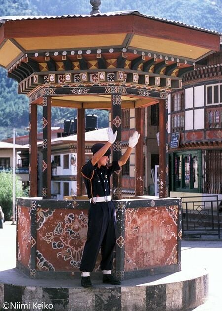 ブータンには国中の道路に信号機が1つもありません。代わりにラウンドアバウト式交差点(円形または環状の交差点)が数多くあり、ティンプー中心部に1カ所にだけ、警察官が手信号で交通整理をしている場所があります。