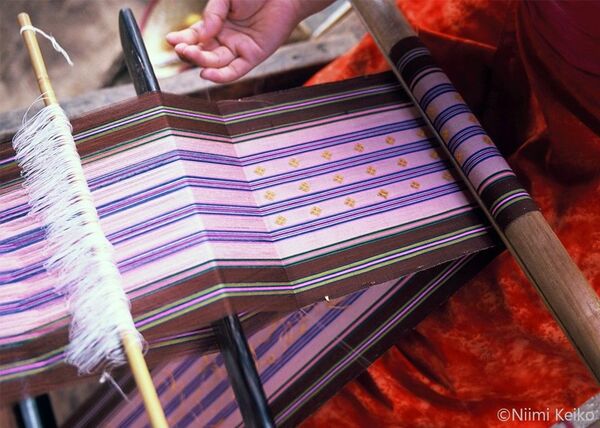 細い絹糸で紡ぐ、繊細で高品質の織物です。ブータンの民族衣装は、男性は「ゴ」、女性は「キラ」というのですが、正装の装束1着分を織るのに1年以上を要するものもあるのだとか。伝統的な紋様の織り方は、母から娘へ、師匠から弟子へと、口述や実地で伝えられているのだそうです。