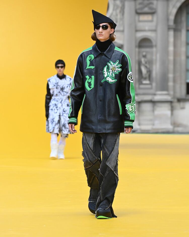 大胆に変形した波打つようなパターニングが特徴の、アイコニックなバイカージャケット。グレー、イエロー、ブラックのなめらかなカーフレザーのパネルに、「Vuitton」と「Vuitton Malletier」シグネチャー、複数の変形したフラップポケットを組み合わせている。ルイ・ヴィトンが誇るサヴォアフェール(匠の技)を体現する、オートクチュールの雰囲気を感じられる。