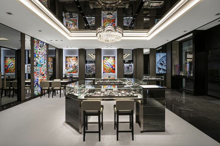 四条通に面したブティック内は、グレーを基調とした落ち着いた内装に色彩豊かなポップアートが融合し、ウブロのブランドコンセプトである「The Art of Fusion(異なる素材やアイデアの融合)」を体現した上質な空間が広がる。