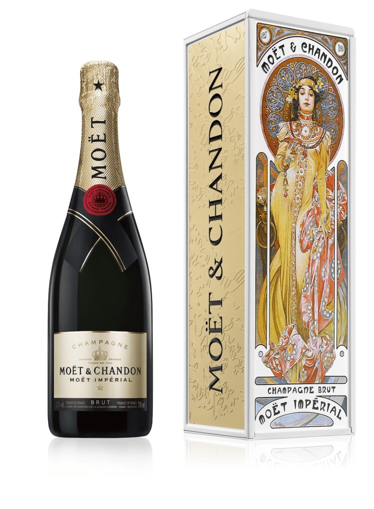 今回登場する限定ボックスは、20世紀初頭に「アール・ヌーヴォーの先駆者」としても知られるチェコ出身の画家のアルフォンス・ミュシャが、モエ・エ・シャンドンのために描き下ろしたポスター画を再現したもの。