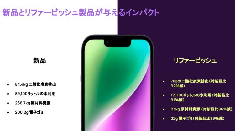 左は新品スマホを1から作った場合。右はすでにあるスマホを再生(リファービッシュ)した場合。