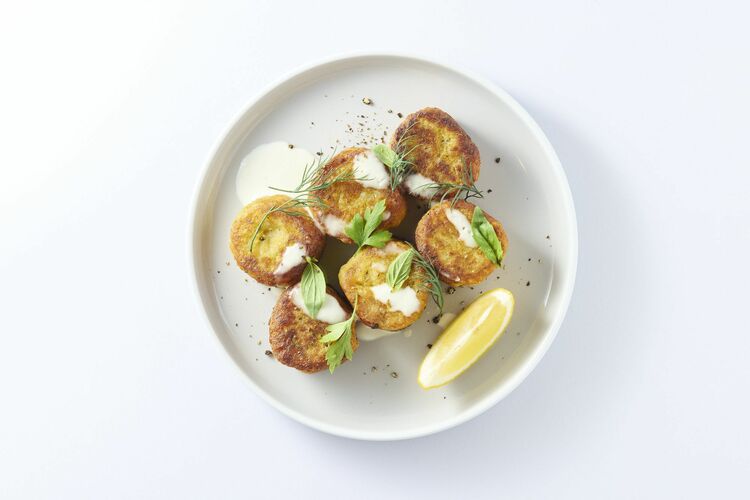 マリアージュフードは「サーキュラー」な素材・生産方法を選び、エネルギー消費を抑えて近隣・関東近郊と「ローカル」という視点を持ち、屋上菜園を活かした「フレッシュ」な店産店消スタイルを目指す、代官山CIRTY CAFE が考案した「ハーブのファラフェル 自家製ケチャップとセサミソース」と「トレビス 柑橘 ビーツのサラダ」