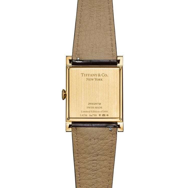 もちろん『ユニオン スクエア』ウォッチは、スイスの熟練職人によって丁寧に手作業で製造されたアイテムでもある。18Kイエローゴールドケースに、ブラウンのアリゲーター ストラップを組み合わせた贅沢な仕様で、リュウズトップには、ブランドを象徴するティファニーブルーがあしらわれている。またケースバックには「Limited Edition」の文字が刻印され、その希少性を物語る。ムーブメントは自動巻きを採用、5気圧防水仕様で実用性も備えている。
