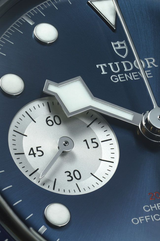 時針には、1969年以来チューダーのダイバーズウォッチのアイコンとなっている「スノーフレーク」針を採用。2つのサブカウンターが配されたブルーダイアルは、最適な視認性を確保している。