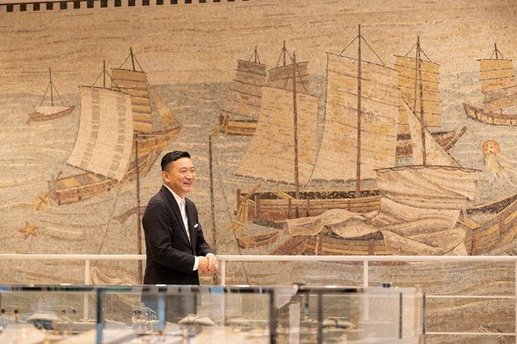 例えば、店舗に入ってすぐの1階の天井から地下まで続く巨大なモザイク画は、海上から海中までの海の断面図ともいうべきテーマでデザインされているが、それを構成するのは、色も形も違う小さなモザイクタイル。そのなかには、曲線や斜線を表現するために、わざわざ、手作業でカットされたものも少なくない。