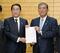 石破首相(右)に自民議員連盟の提言を手渡す岸田前首相(写真:共同通信社)