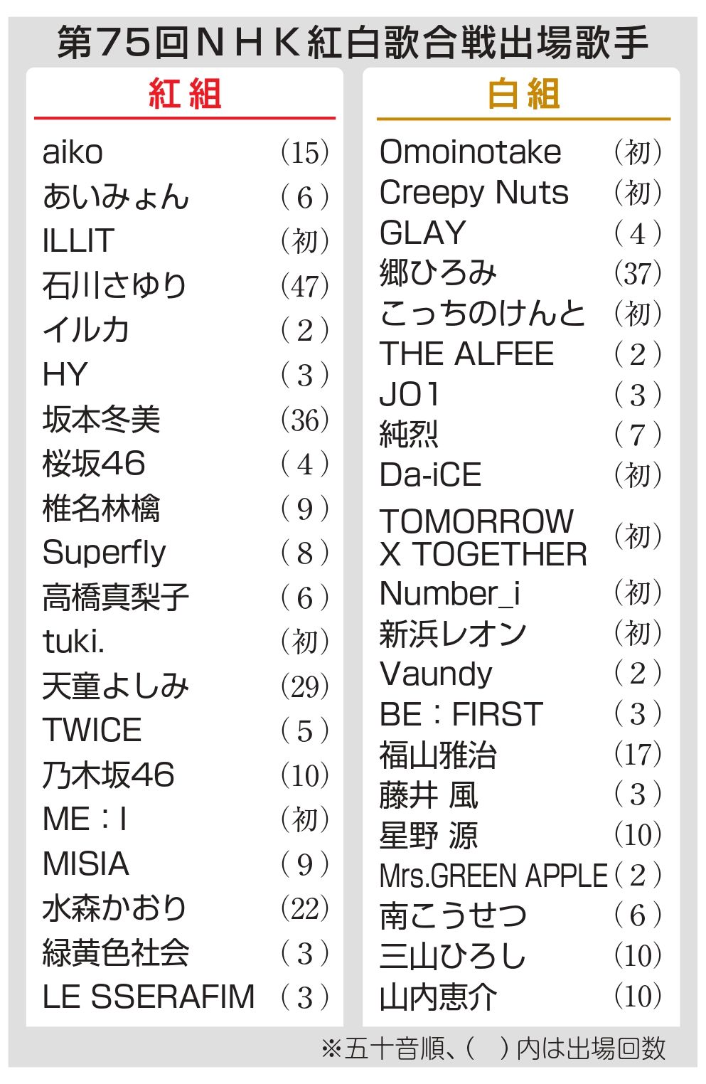 2009年頃から女性に人気の高い旧ジャニーズ事務所(現・STARTO ENTERTAINMENT)の歌手・グループの出場を増加させる作戦。一昨年までは毎年5~6組を出場させた他、嵐のメンバーが2019年までほぼ毎年、司会を担当するという厚遇ぶりでした。しかしご存知の通り、故ジャニー喜多川元社長の性被害問題が浮上し、昨年は出場ゼロ。その影響が少なからず視聴率にも表れていたとも言えます。引き続き、今年もゼロですが、旧所属のNumber_i(元King&Princeの3人が在籍)が復活したのが、僅かでも浮上のキッカケとなりますかどうか・・・。