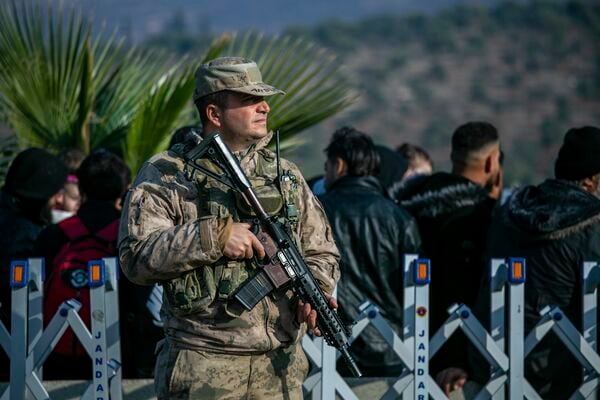 シリアとの国境付近を警備するトルコ兵士(写真:AP/アフロ)