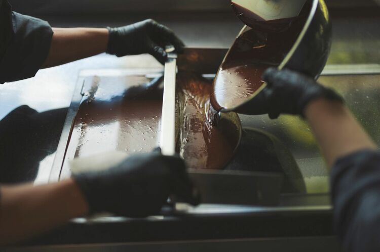 約1年にわたる七賢との共同開発では、『アラン・デュカス サステナブル・スピリッツ』の37%というアルコール度数が、ウイスキーやラム酒などのアルコール度数40~50%程度の蒸溜酒と比べてやや低いことが難しいところだったという。スピリッツの味わいを出そうとすると、多くのスピリッツを使う必要があり、そうすると水分量が多くなりガナッシュとしてバランスをとることが難しいのだそうだ。