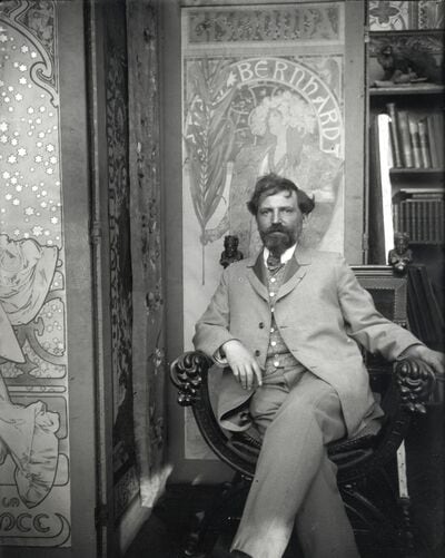 《ジスモンダ》のポスターを背にしたミュシャ、パリ、ヴァル=ド=グラース通りのアトリエにて 1901年頃 ミュシャ財団蔵 ©2024 Mucha Trust