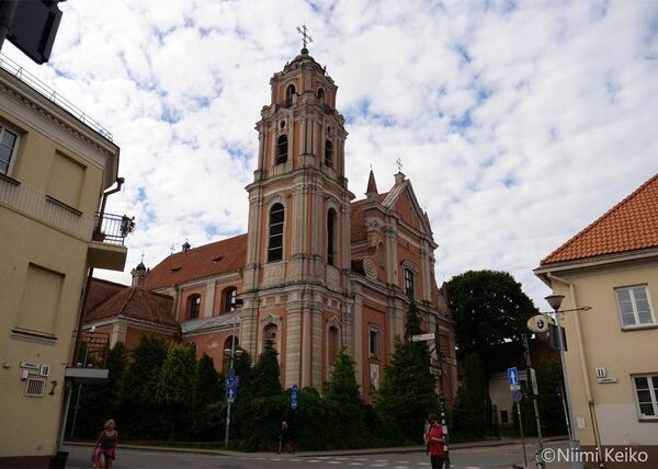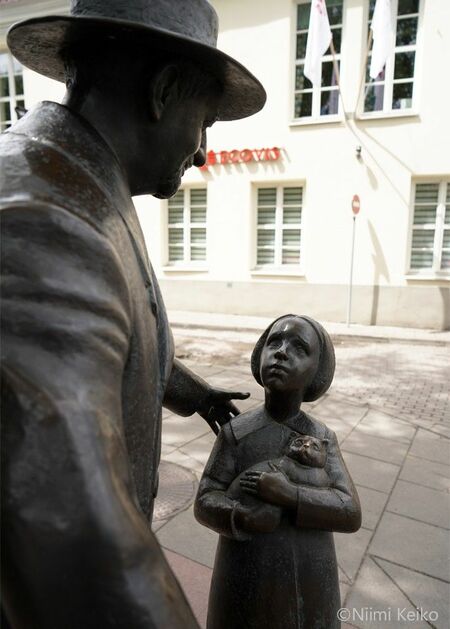 「アイボリット獣医さん」のブロンズ像です。ロシアの児童文学作家、コルネイ・チェコフスキーの代表作『ドクトル・アイボリット』のモデルは、ヴィリニュスに実在した人物(獣医師)で、この近くに居住していたそうです。「猫の具合が悪いの」と少女が心配して相談しているところでしょうか。アイボリットさんは、動物と話すことができたそうですので、どこが不調なのか、猫から話が聞けたのかもしれません。