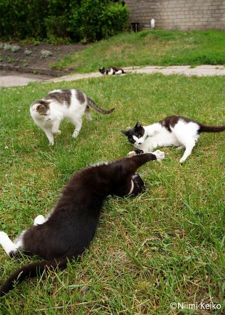 マンションの中庭では何匹もの猫たちが遊んでいました。
